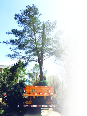 一棵20年樹齡的樟子松被裝上車
